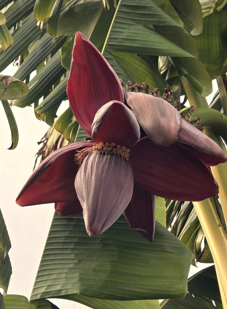 Banana plants offer one more edible delight. The large pinkish purple flowers can be eaten. They have a mild, slightly nutty and earthy taste. They can be chopped, sauteed or incorporated into curries, salads or casseroles. They can be purchased at many local farmers markets, Asian and Indian grocery stores. Banana flowers and banana leaves are an exciting way to bring the taste of paradise into a meal.